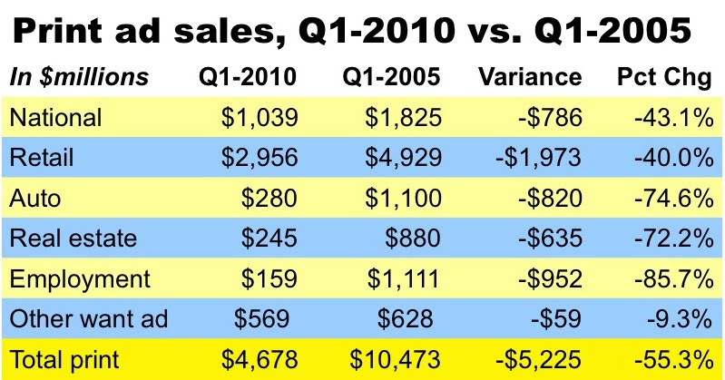 I ricavi pubblicitari nel settore sono calati dell’ 11,4% nei primi tre mesi del 2010, raggiungendo i 5,2 miliardi di dollari, secondo i dati appena diffusi dalla Newspaper Association of America. Ma comparando questo dato con i 10,3 miliardi di dollari dello stesso periodo del 2005 si ottiene una perdita del 55,3%.