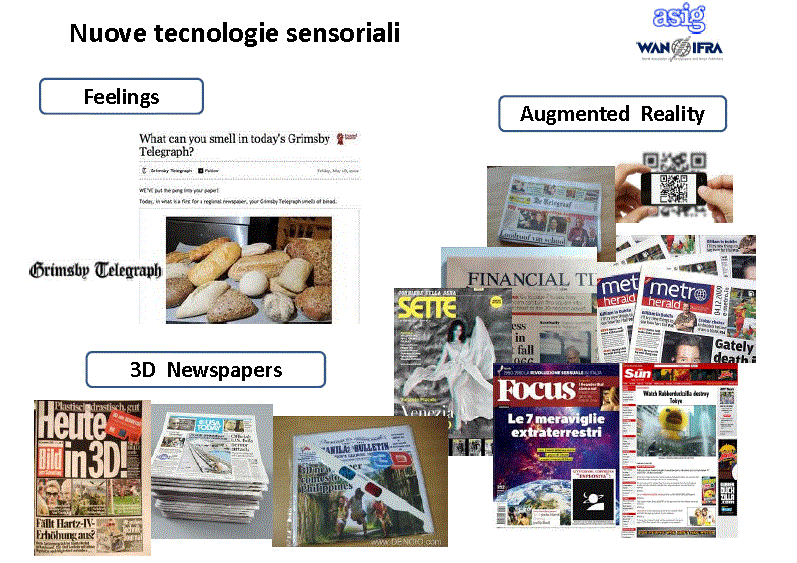 Ci provano, invece, a lanciare qualche idea, gli stampatori di giornali. Per uscire dalla crisi, infatti, secondo Sergio Vitelli, segretario Asig (qui la sua relazione), per i media su carta, occorre puntare su nuovi prodotti editoriali e nuove sezioni tematiche, prendendo in considerazione le nuove tecnologie “sensorialiâ€, come la realtà aumentata, i “profumi†e la stampa in 3D. Per i media digitali, le strade possibili passano per gli aggregatori pluri e mono testata di Gruppo, per nuove edizioni digitali e nuove strategie di fidelizzazione dei clienti, dal geotagging di notizie e offerte commerciali, fino alle App personali.